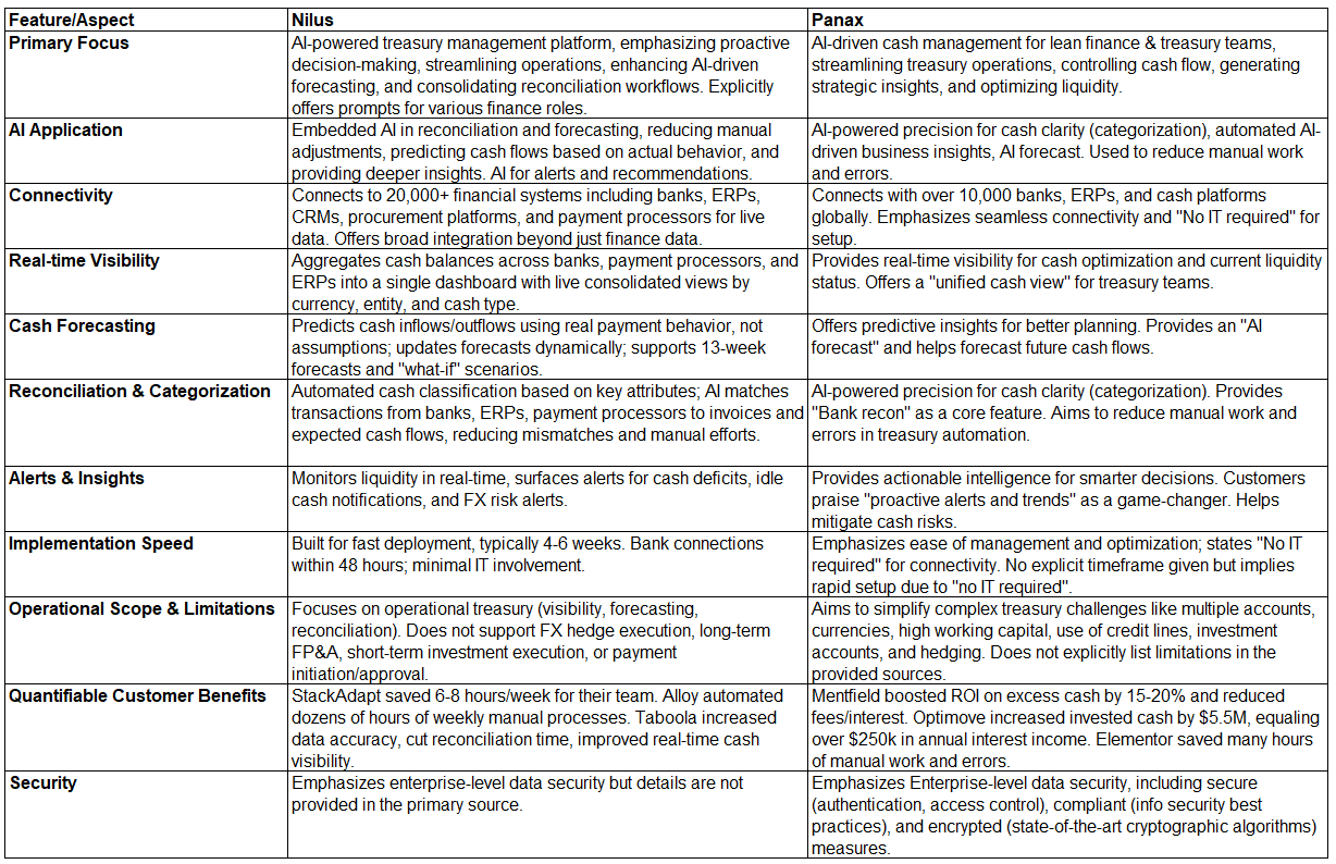 Both Nilus and Panax are AI-driven solutions aiming to optimize cash management for finance and treasury teams, but they offer distinct focuses and capabilities.